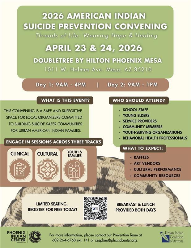 Presented by the Urban Indian Coalition of Arizona and the Phoenix Indian Center, this convening is a safe and supportive space for local organizers committed to building suicide-safer communities for urban American Indian families.