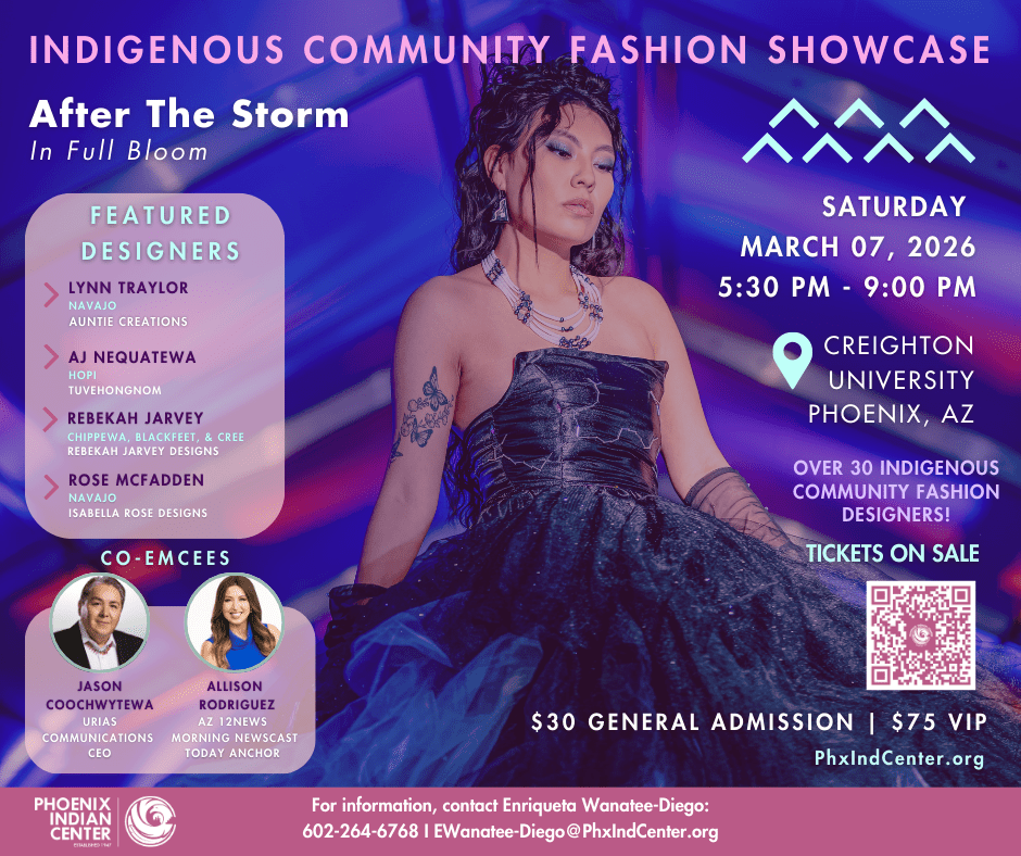 The Phoenix Indian Center is proud to present our 5th Annual Indigenous Community Fashion Showcase on Saturday, March 7, 2026 — now at our new location in Downtown Phoenix at Creighton University’s Doris S. Norton Ballroom!
