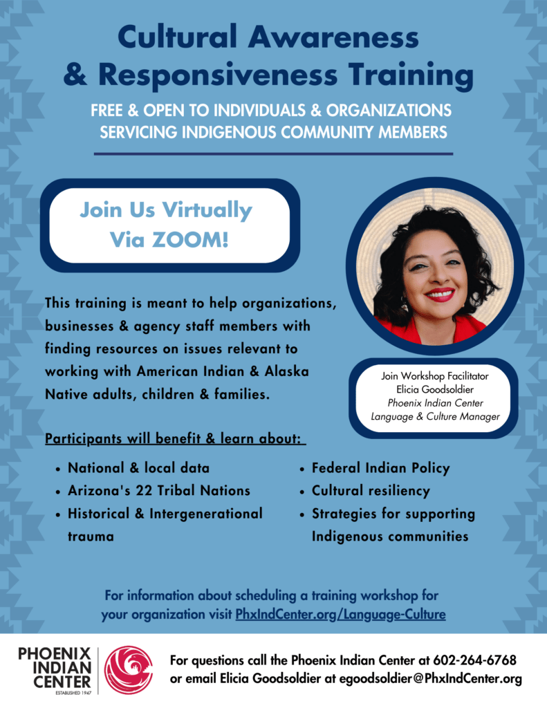 This program is available to all without regard to race, color, national origin, sex, age, religion, sexual orientation, disability (mental or physical), gender identity or expression, political affiliation, marital or parental status, pregnancy, genetic information (including family medical history), military service, or their submission of a complaint. Compliance information and/or history can be requested from Elicia Goodsoldier, Language and Culture Manager at egoodsoldier@phxindcenter.org or by calling 602-264-6768.